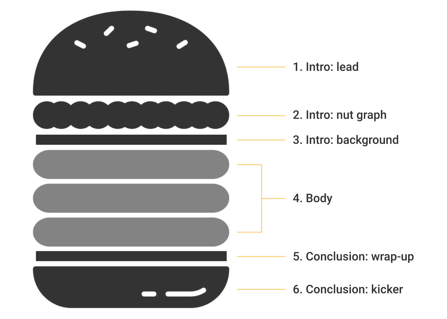 Just like your teacher taught in school, good stories have a beginning, middle, and end. Call this your intro, body, and conclusion. But each of these sections has its own pieces – six in total. Think of it like a hamburger, which we’ll unpack now.